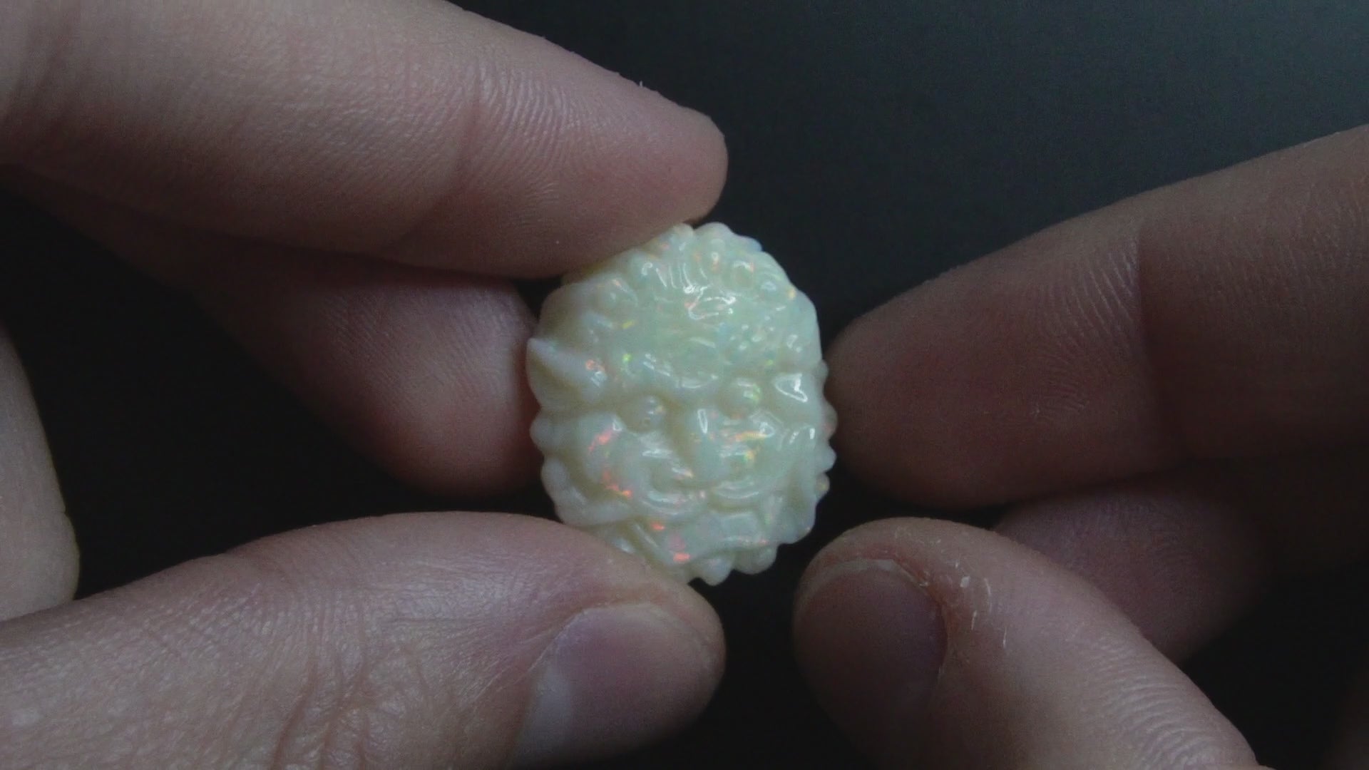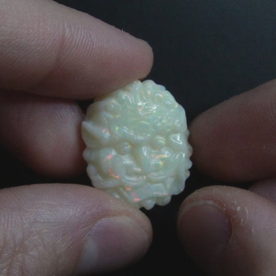 This White Opal has been expertly carved with speckles of red across the whole opal adding the perfect emphasis to the style of traditional Japanese samurai mask.