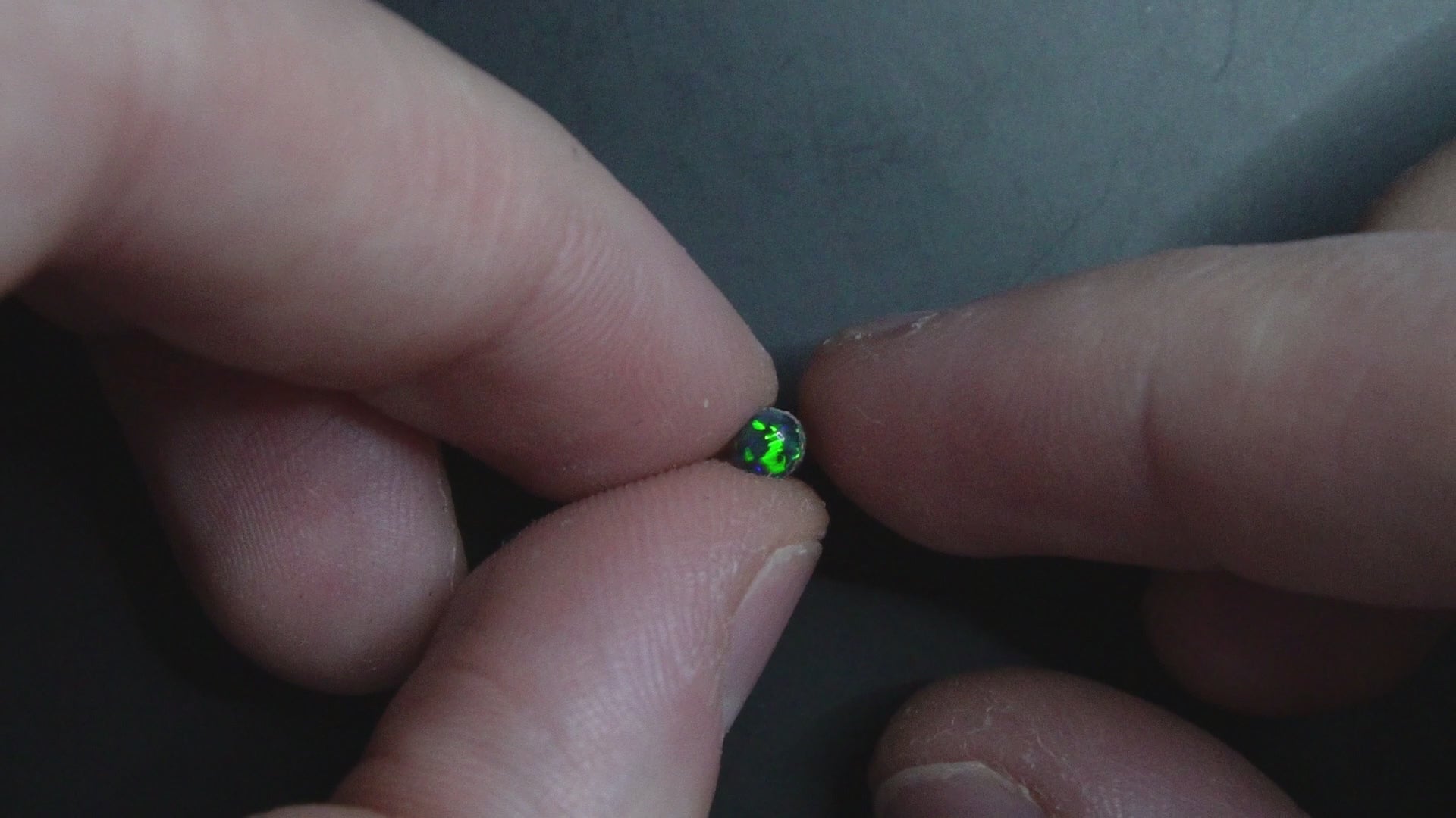 A small black opal with flashes of green.