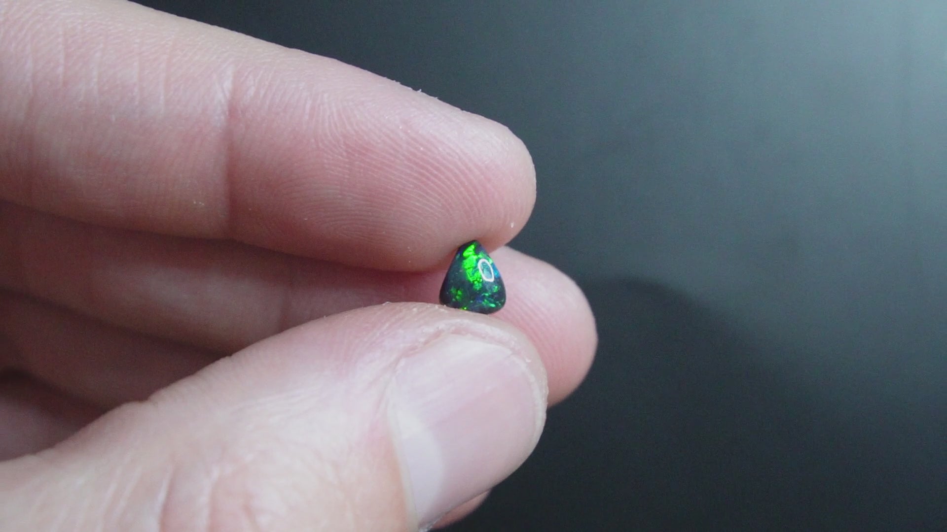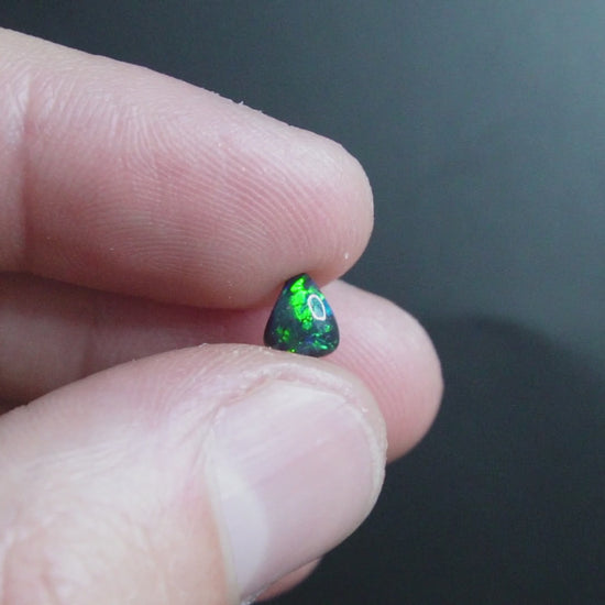Trillion shaped black opal. Very dark body tone with bright green colour play.