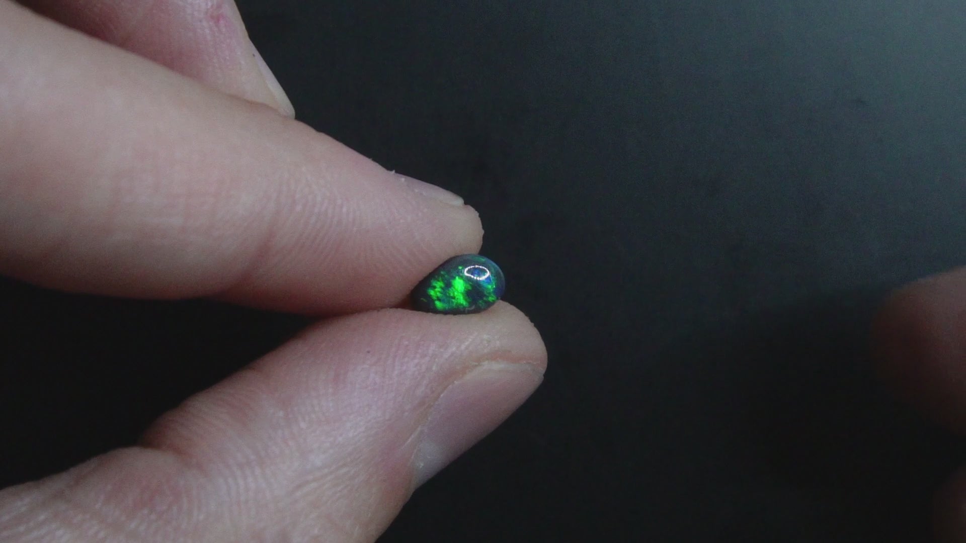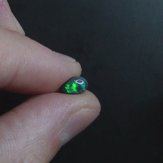 Black opal with free form shape with rolling flashes of green colour.